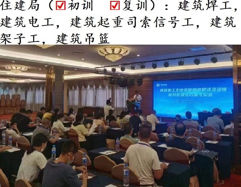 开设:熔化焊接,低压电工,高压电工,高处安装维护拆除,登高架设,制冷与空调,有毒有害有限空间,生产管理人员,生产经营单位负责人,建筑焊工,建筑电工,建筑起重司索信号工,建筑架子工,建筑吊篮,施工员,质量员,材料员,资料员,机械员,劳务员,标准员,建筑员ABC,管道工,防水工,油漆工,变电设备安装工,线路架设工,下水道养护工,装载机,挖掘机,移动式升降工作平台,PC套筒灌浆工,PC构件制作工,PC构件装配工,PC模具工,PC质检工,叉车司机N1 ,特种设备管理员A,起重机指挥Q1,起重机司机Q2,(消防设施操作员(监控/维保),消防管理人员(消防责任人/管理人,动火作业人员(动火审批、监护、操作)