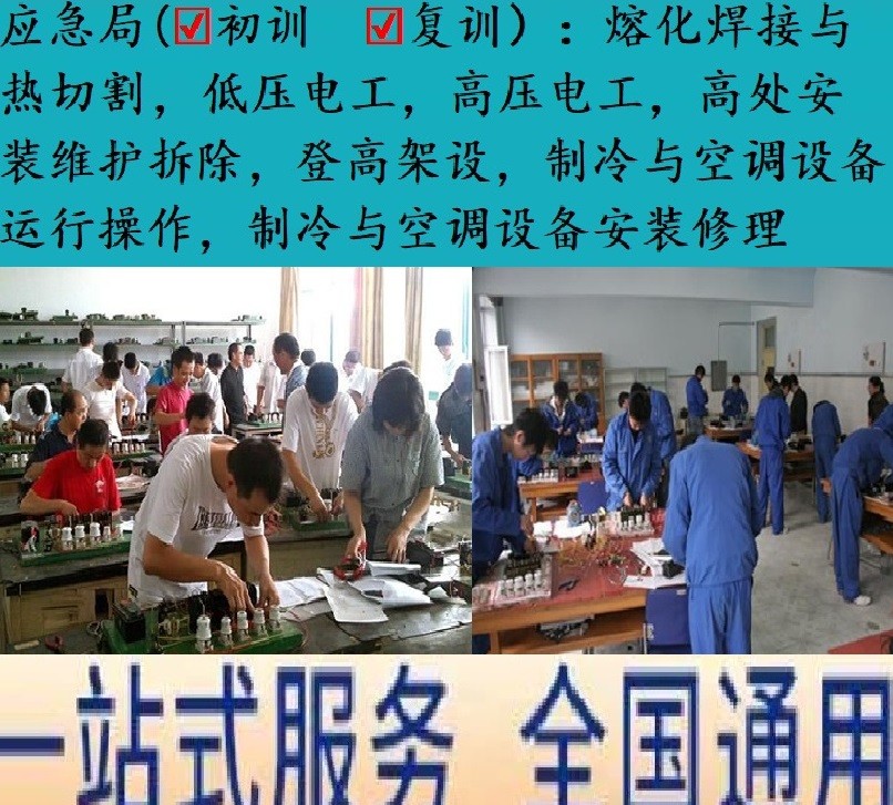 开设:熔化焊接,低压电工,高压电工,高处安装维护拆除,登高架设,制冷与空调,有毒有害有限空间,生产管理人员,生产经营单位负责人,建筑焊工,建筑电工,建筑起重司索信号工,建筑架子工,建筑吊篮,施工员,质量员,材料员,资料员,机械员,劳务员,标准员,建筑员ABC,管道工,防水工,油漆工,变电设备安装工,线路架设工,下水道养护工,装载机,挖掘机,移动式升降工作平台,PC套筒灌浆工,PC构件制作工,PC构件装配工,PC模具工,PC质检工,叉车司机N1 ,特种设备管理员A,起重机指挥Q1,起重机司机Q2,(消防设施操作员(监控/维保),消防管理人员(消防责任人/管理人,动火作业人员(动火审批、监护、操作)