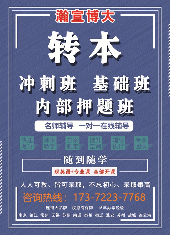 江苏瀚宣·博大五年制专转本培训机构,深耕专转本培训领域已有十七年,汇聚了众多转本经验丰富的授课老师,小班化教学,帮助同学们提高复习效率,找到复习方向。针对性辅导一门英语和两门专业课,从基础测试、学习规划、课程安排、学习·进度、查漏补缺、刷题等等一步步来推进。采用全年滚动开班模式,随到随学,一次报名可循环上课至考前,越早报名课时量越多,江苏省内13市的1-5年级高职生均可以参加;从基础知识点讲解到高频考点强化,再到模拟冲刺训练,层层递进,帮助学生逐步夯实基础、提升能力。更多江苏五年制专转本详情请联系173微7223同7768严老师,预约试听课程并领取招生简章一份。同学和家长有空余时间可以先来实地考察上课环境、师资情况及录取率后再做考虑。