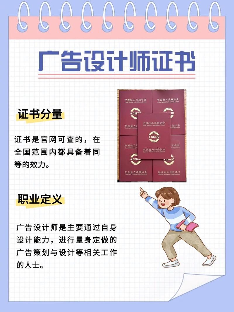 行业发展的必然趋势:随着广告行业日益规范,持证上岗已成为大势所趋。提前布局,考取证书,就是为您的职业生涯购买了一份“增值保险”,在未来的人才竞争中占据优势。