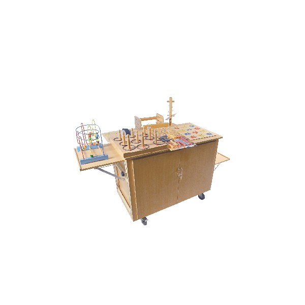 桌面通常设置有各种形状的孔洞、扣环以及穿珠、拼图等训练模块,患者通过将不同形状的物体插入相应孔洞、穿珠子或拼图等活动,锻炼手指的精细动作技能,提升手眼协调能力。